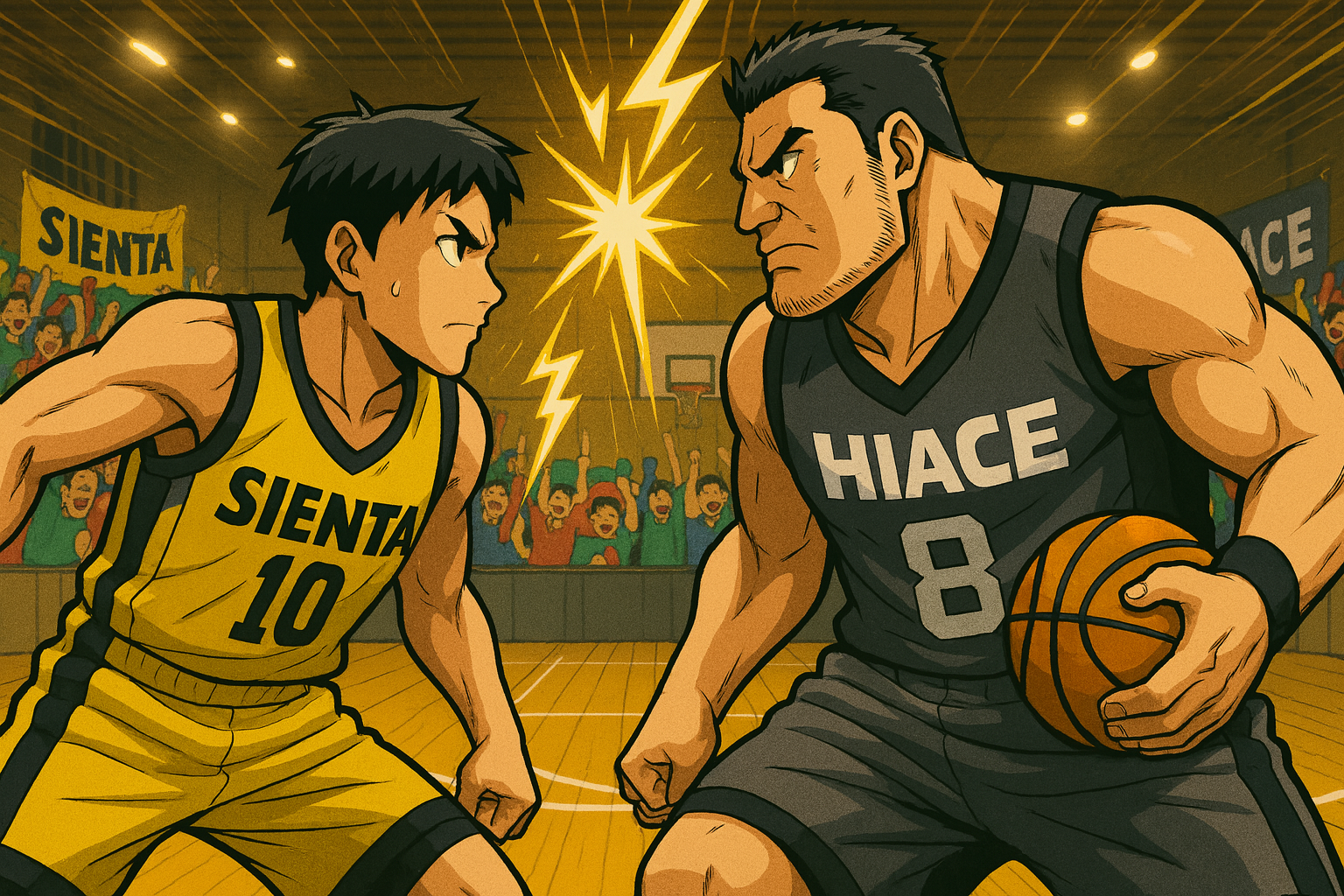 試合前の実況:「ティップオフ直前。機動力のシエンタと、リム下を支配するハイエース。舞台は“日常”という名のレギュラーシーズン、さあコートに入ります!」